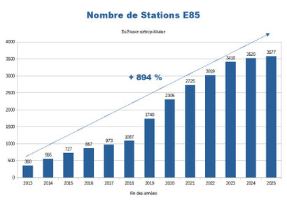Avec près de 3800 stations (soit bientôt une station sur deux) en octobre 2025, la France dispose aujourd'hui du plus grand nombre de pompes distribuant du Super-éthanol en Europe.